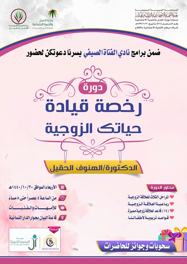 تقيم لجنة التنمية الاجتماعية الأهلية بالهدار “القسم النسائي” ضمن برامج (نادي الفتاة الصيفي) دورة تدريبية بعنوان (رخصة قيادة حياتك الزوجية) تقدمها الدكتورة/ الهنوف الحقيل وذلك يوم الأربعاء الموافق 30-10-1440هـ في قاعة البيان بجوار الدار النسائية.