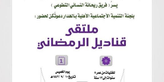 نفذ فريق ريحانة التطوعي النسائي بلجنة التنمية الاجتماعية الأهلية بالهدار (ملتقى قناديل الرمضاني) في يوم الخميس الموافق 10-09-1442هـ عبر منصة الزوم واستفاد من الدورة (38) من الفتيات.