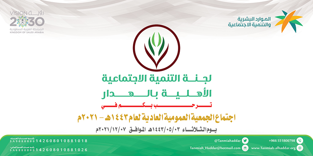 عقدت لجنة التنمية الاجتماعية الأهلية بالهدار اجتماع الجمعية العمومية العادية لعام 1443هـ – 2021م، حيث افتتح رئيس مجلس الإدارة اجتماع بالترحيب بأعضاء الجمعية العمومية وشرح لهم طريقة التصويت للانتخاب لمجلس الإدارة والتصويت على الموافقة على اللائحة الأساسية لنظام الجمعيات الأهلية لبدأ تحول اللجنة إلى (جمعية التنمية الأهلية بالهدار).