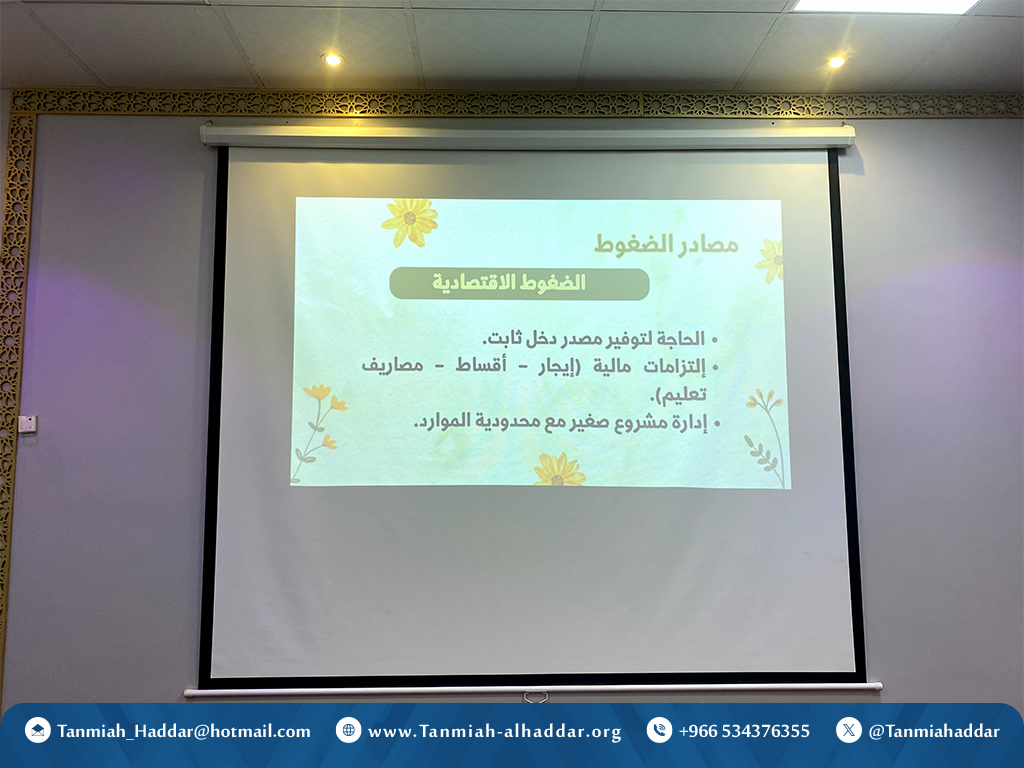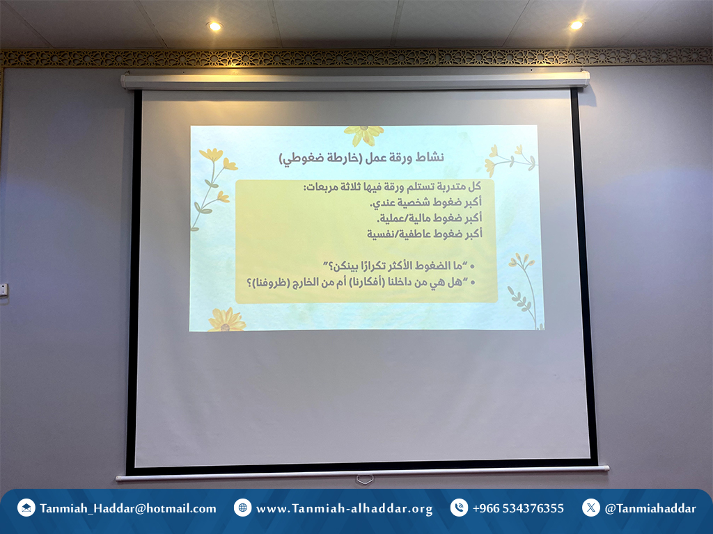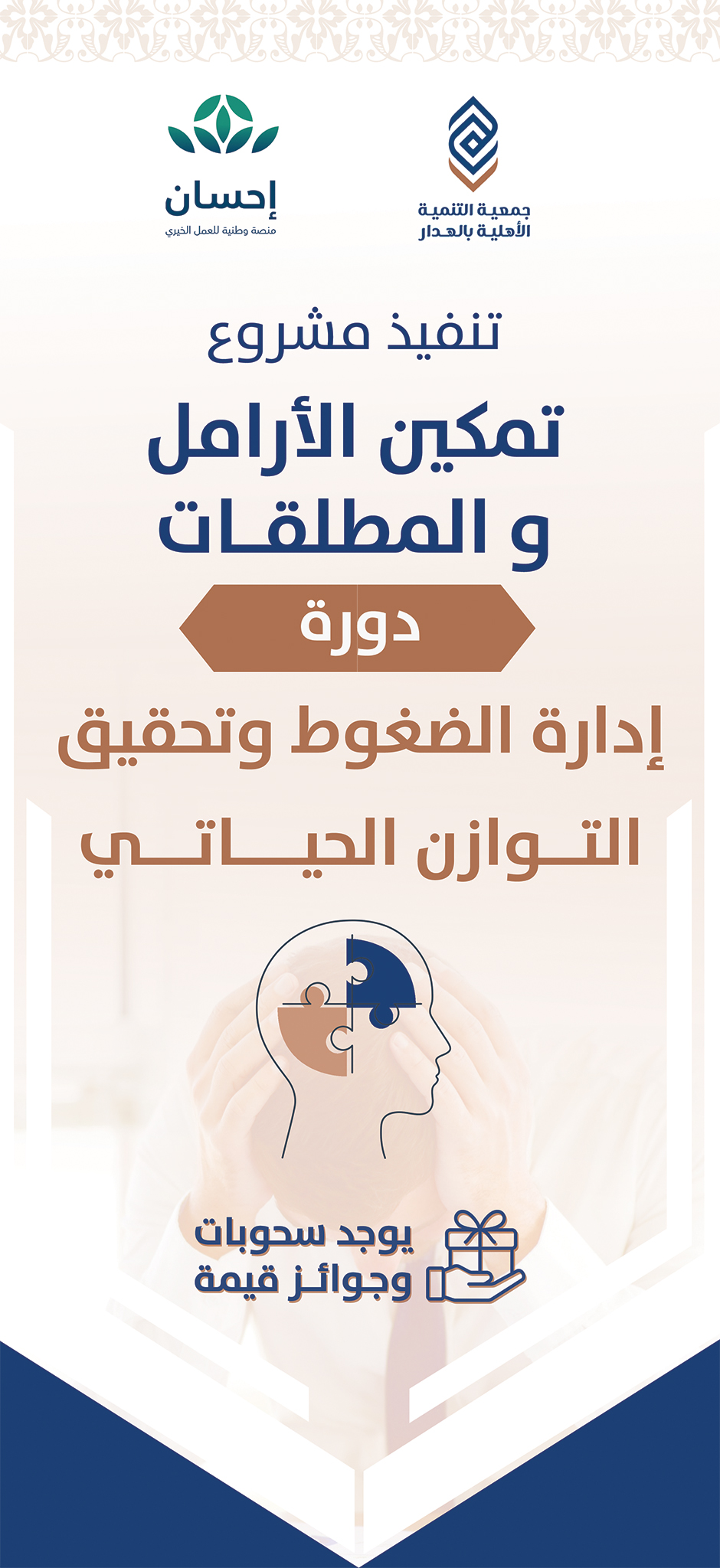 نفذت جمعية التنمية الأهلية بالهدار دورة (إدارة الضغوط وتحقيق التوازن الحياتي) ولمدة ثلاث أيام من 27 إلى 28-3-1447هـ قدمتها أ.سعدية السليمان ضمن برنامج (تمكين) الذي يهدف إلى تأهيل (70) من المطلقات والأرامل وتمكينهن لسوق العمل، من خلال تقديم دورات تدريبية تخصصية متنوعة.