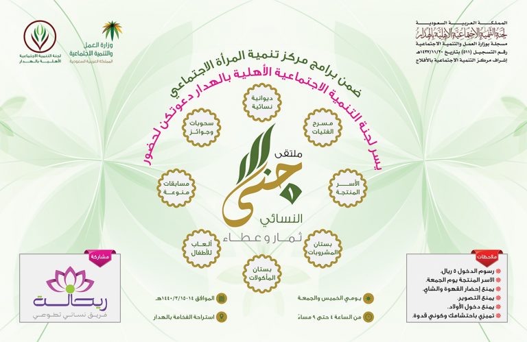 ضمن برامج مركز تنمية المرأة الاجتماعي أقامت لجنة التنمية الاجتماعية الأهلية بالهدار (ملتقى جنى النسائي الأول) وذلك يومي الخميس والجمعة…