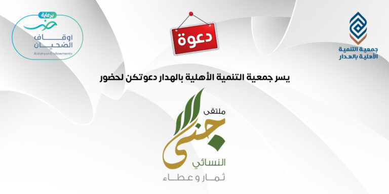 يسر جمعية التنمية الأهلية بالهدار دعوتكن لحضور فعاليات ملتقى جنى النسائي وذلك يومي الاثنين والثلاثاء الموافق 08-09/ 02/ 1446هـ